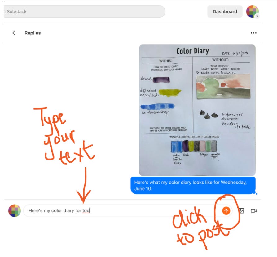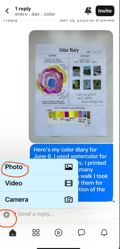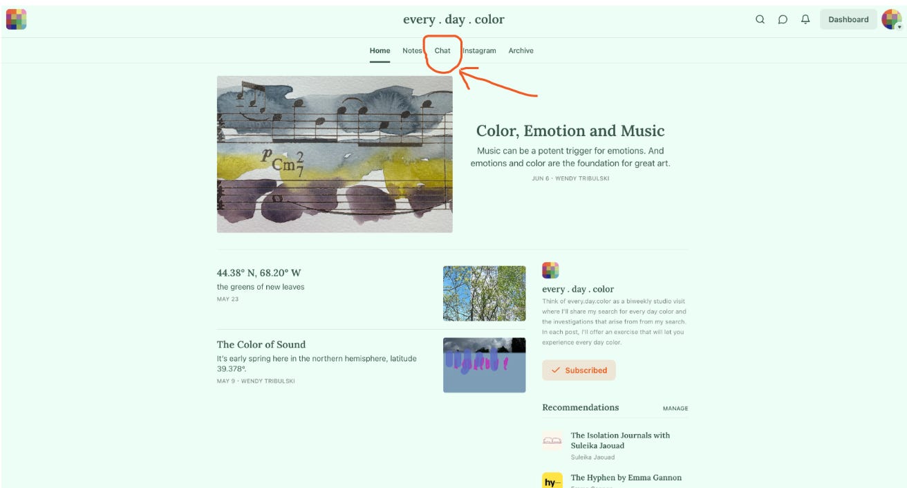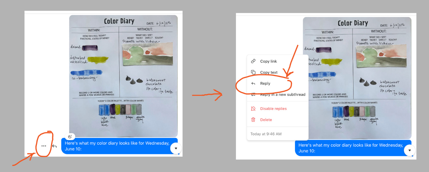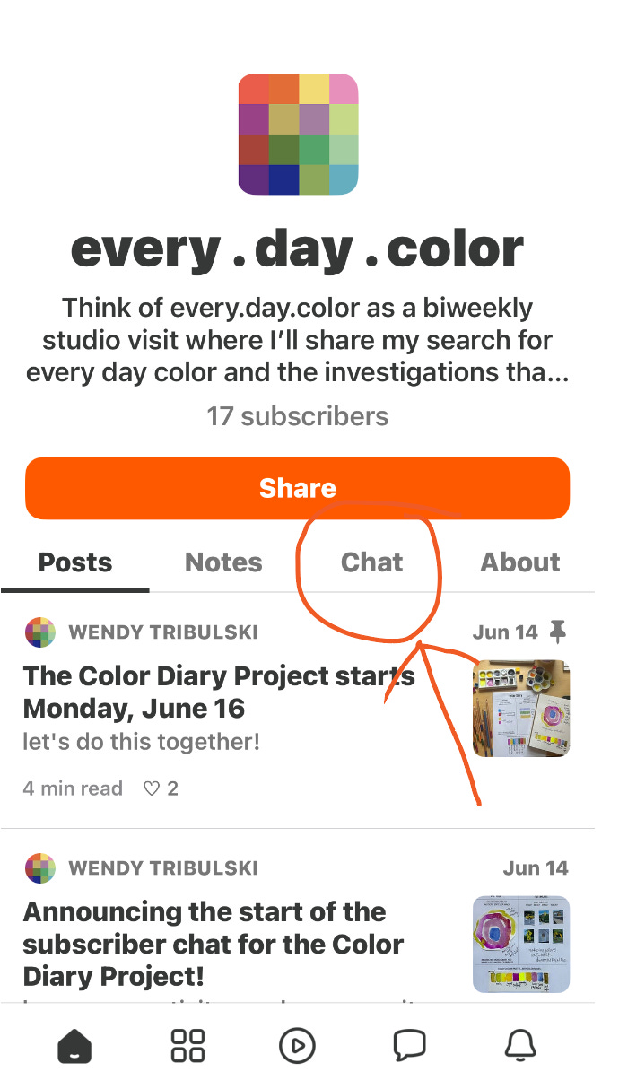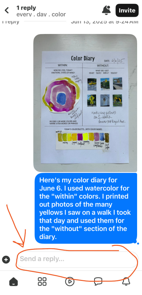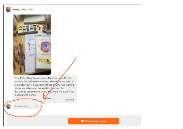 Participants in the Color Diary project can share their thoughts and images in the every. day. color chat. You’ll get a notification in your email each time I post a prompt in the chat (daily). This can serve as a reminder and motivation to work on your color diary.