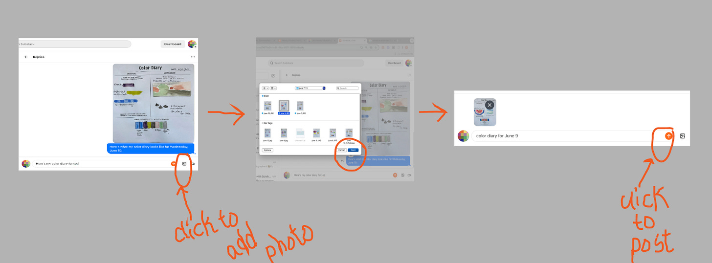 Text and and an image? type your response, click the photo icon, locate your photo and click "open." You'll see you photo load in the response box. Then click the orange up arrow.