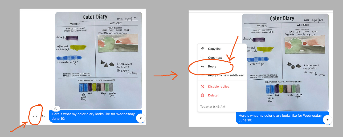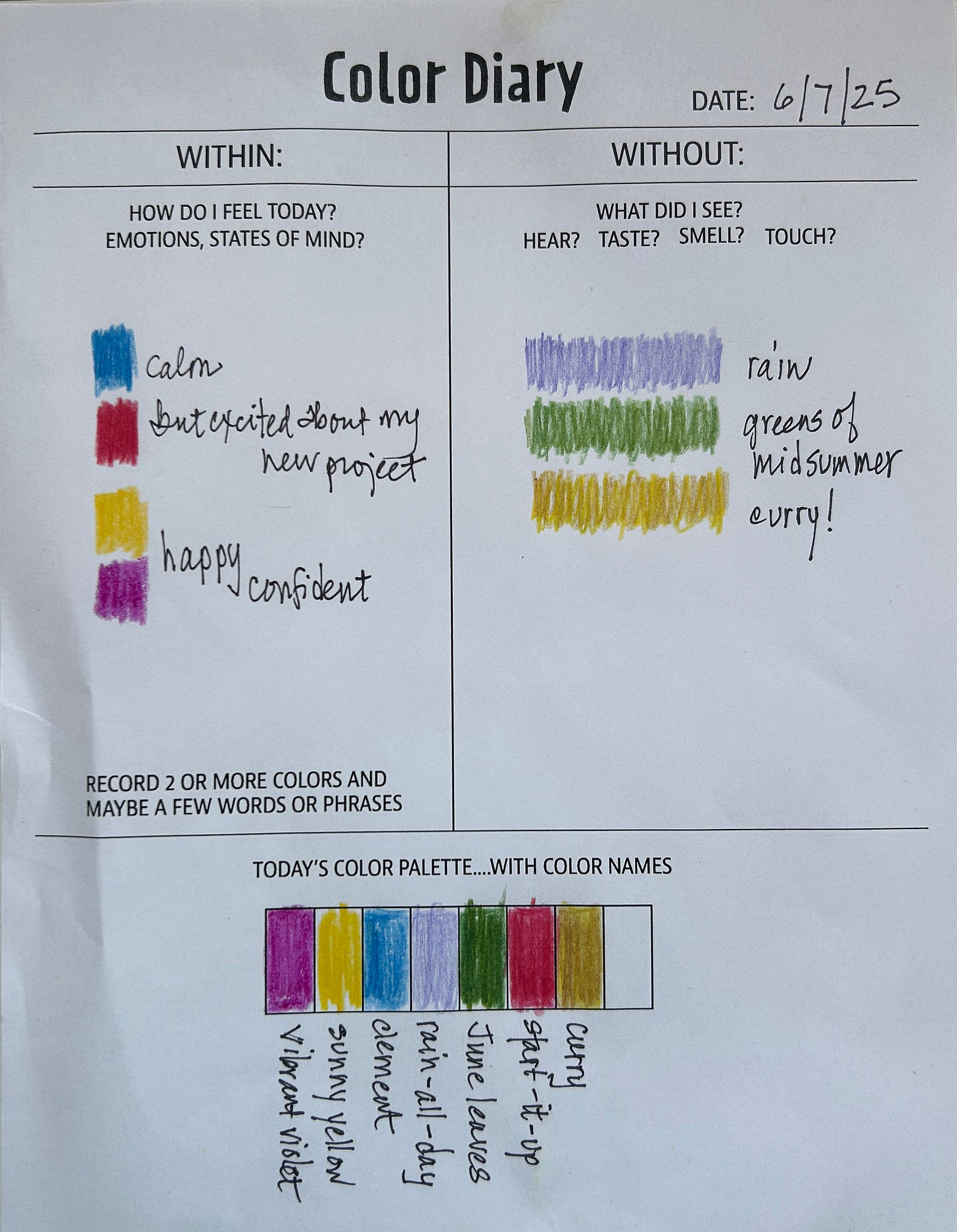 After the initial seven days, starting on Monday, June 23, I’ll suggest ways that you can unpack and reflect on the contents of your color diary. These suggestions will appear daily in the chat.